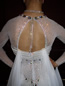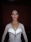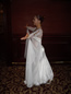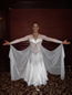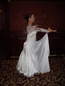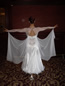 This ballgown was made in the spring of 2010 and is truly a dress for a champion. There are four skirts, the top skirt of white satin chiffon and the bottom three skirts of white chiffon. Floats on both sides of the dress are attached at the back and the wrists, also made of white chiffon. The bodice is white mesh, with white satin pleats creating a sweetheart topline and running to a point in the back. Absolutely covered in swarovski crystals, this is a perfect dress to look like a champion on the ballroom floor.