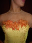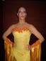This beautiful gown is a classic, sure to look in style no matter what year, and no matter what the fad. A pure yellow color, the bodice is made of yellow and nude mesh, the top skirt and huge floats of canary yellow satin and the underskirt of yellow organza. On the front and back of the bodice, as well as both arms, are sewn orange flowers. The entire dress has over 40 gross of Swarovski crystal rhinestones. Earrings included.